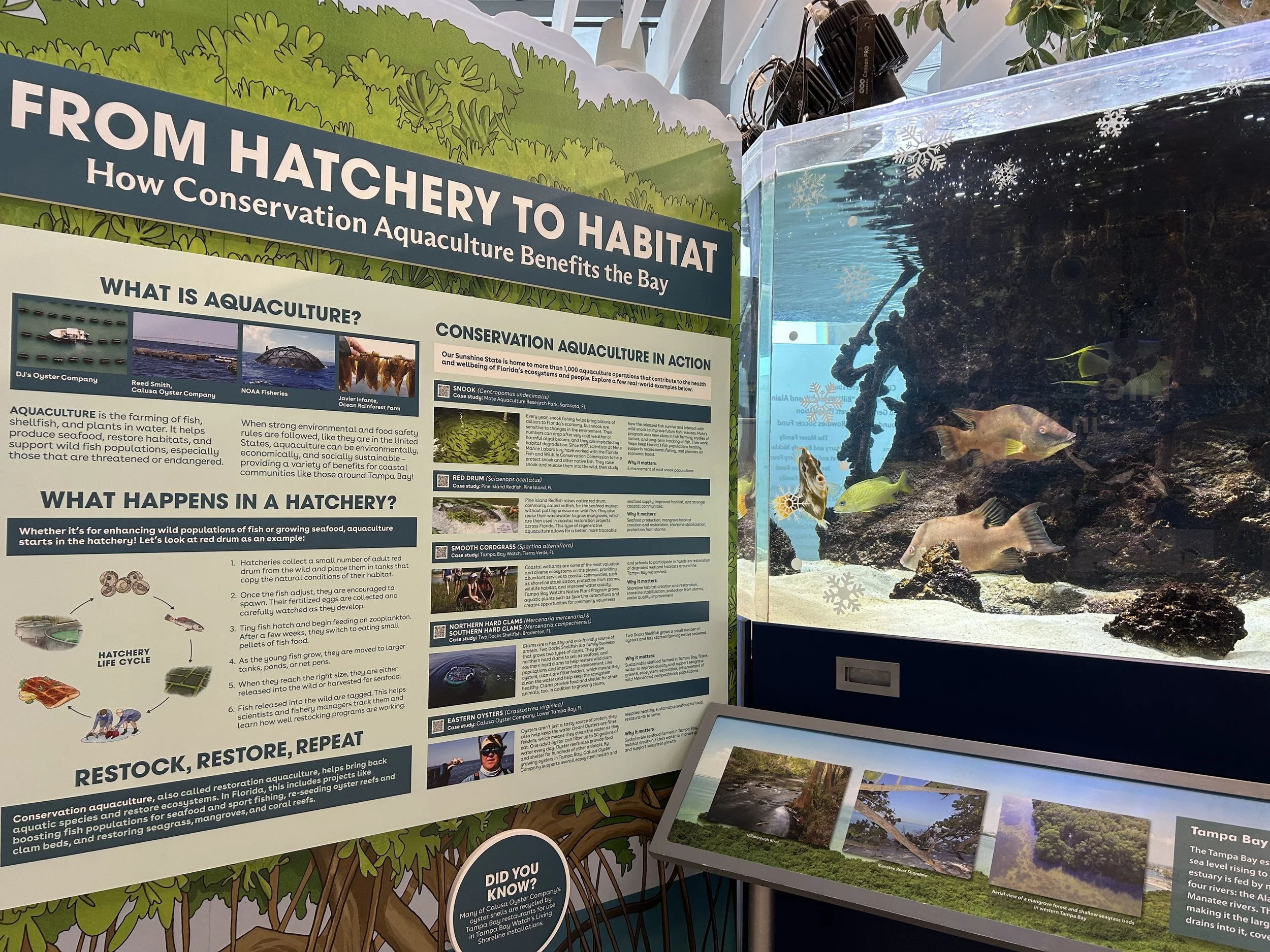 Discover how aquaculture can help produce seafood, restore habitats, and support wild fish populations, providing a variety of benefits for coastal communities like those around Tampa Bay. After viewing the display, play our virtual fishing game and test your knowledge by taking an interactive quiz. This exhibit was developed by Tampa Bay Watch, Mote Marine Laboratory & Aquarium, and NOAA, with support from an eeBlue Aquaculture Literacy Mini-Grant.